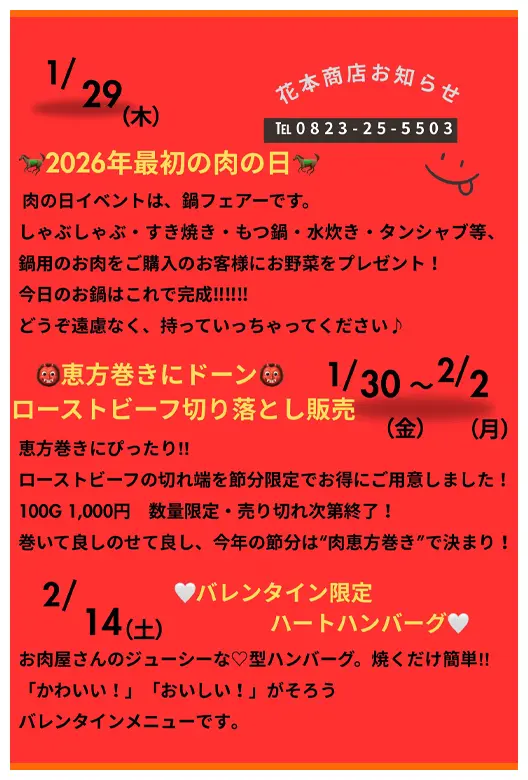 Wed, Jan 28, 2026肉の日イベント&節分イベントのお知らせ~呉のお肉屋さんは花本商店~肉の日イベント&節分イベントのお知らせ~呉のお肉屋さんは花本…Read More