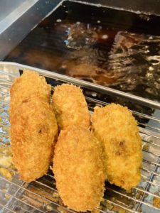 こんにちは、広島県呉市にある街の小さなお肉屋さん花本商店です。 創業70年の花本商店は、ローストビーフをはじめとし、すき焼きセットやハンバーグに焼豚、ソーセージなどもオンラインショップで販売しております。 呉が大盛り上がりになっている、「艦これ」イベント。昨日の日曜日は店休日でした。 艦これイベントの下見や予行演習で来られたお客様ごめんなさい。 今週のイベントに備えてチャージアップしてきましたので準備万端です。 花本のコロッケについて、、、、 こちらの店舗に移転して22年が経ちます。(平成22年12月店舗移転) 移転前はコロッケなど揚げ物はなく、精肉と加工食品だけでした。 やっぱりお肉屋さんはコロッケがなくては! となり牛肉たっぷりコロッケを作りました。 その名の通り、牛肉がゴロゴロ。 学校帰りの高校生が買ってくれたりと、すぐに花本の人気商品に! そして、呉といえば肉じゃが、、、、 甘く炒めた玉ねぎと、にんじん、牛肉を使った肉じゃがのコロッケは絶対おいしい!と思い 販売開始。