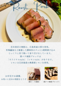 こんにちは、花本商店です。 創業74年の花本商店は、ローストビーフを始めとし、すき焼きや、ステーキ、焼き肉セット、 手ごねハンバーグに焼き豚をオンラインでも販売しています。 HANAMOTO自家製焼豚 豚バラ焼豚ブロックは月に2回販売しています。 隔週で、ガイヤーンと豚バラ焼豚を販売です。 次回の販売は、3月10日です。 即完売のこちらの焼豚ブロック! 一度は食べたいと思ったら、、、、 ご予約ください! 豚のいい脂がのっています。 肉のあまみが出ています、。 食べたらわかります! 食べた人にしかわかりません。 どうぞ!!0823−25−5503 29hanamoto@gmail.com