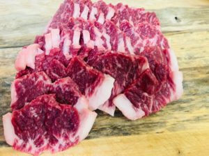 牛肉の肩バラ肉のことで、広島県以外では「ブリスケ」や「前バラ」、「肩バラ」とも呼ばれたり。 1頭からは2kgほどしか取ることのできない希少部位です。 肉質は硬く、サシはほとんど入りません。 凝縮された赤身の深い味わいがあり、噛めば噛むほど旨みが染み出てくるような肉です。