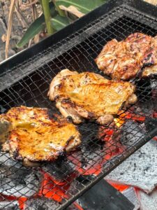 太陽の恵みを浴びながら、ガイヤーン自家製焼豚は花本商店のお庭で焼いております。 焼豚は3種類ありますので、食べくらべてお気に入りを見つけてください。