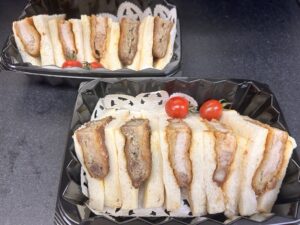 ローストビーフ、ローストチキン、焼豚、生ソーセージを焼いたもの、揚げ物、カツサンドにメンチカツサンドetc