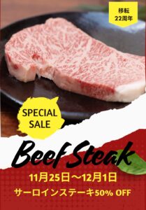 11月25日(月)〜12月1日(日)店頭、オンラインショップでサーロインステーキを50%OFFで販売!