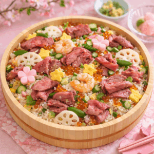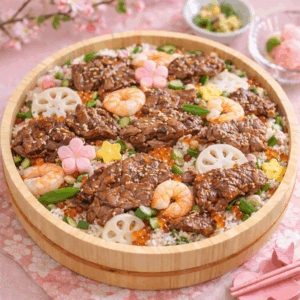 花本商店では、このちらし寿司に“お肉のおいしさ”を組み合わせた、ひな祭りならではの楽しみ方をご提案します。