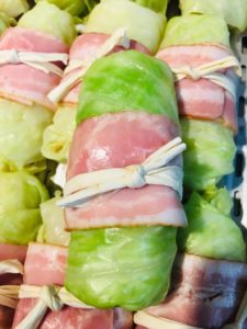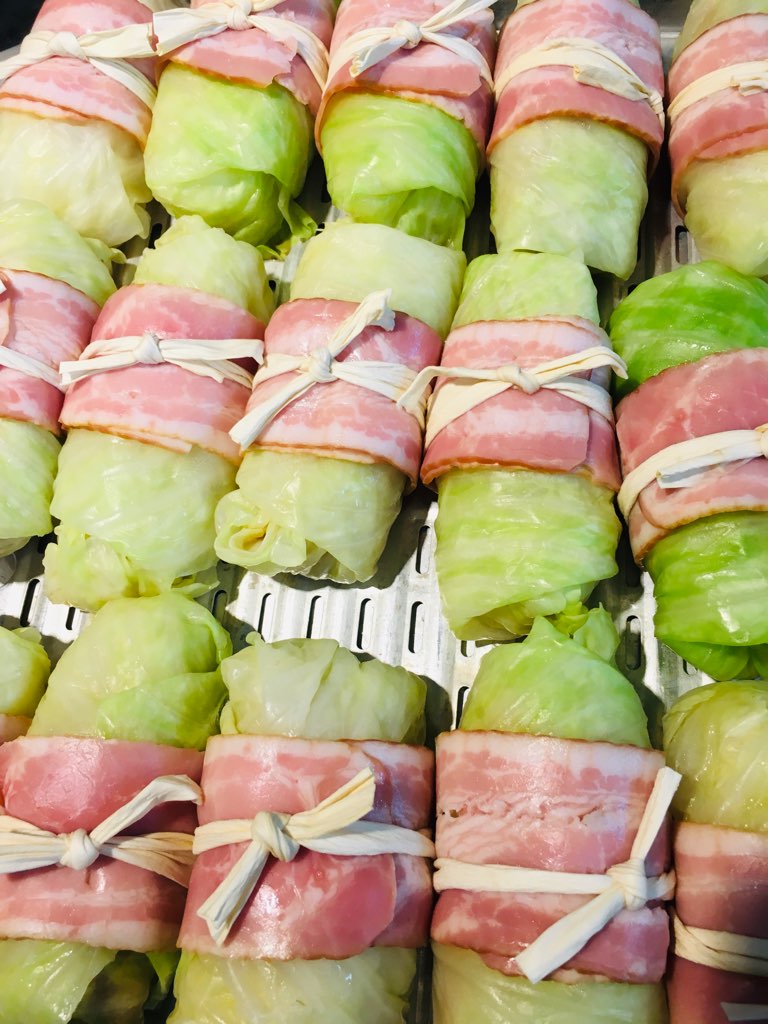1個に付き2~3枚のキャベツを使用し、そこにお肉を巻き込み ベーコン・かんぴょうで仕上げます。 キャベツがびっくりするぐらい大きく湯がくのも一苦労です!(笑) ロールキャベツの中のお肉は、手ごねハンバーグと同じです。 味付けはご自由にコンソメスープやトマト煮、クリーム煮、 おでんにそのまま入れてもお召し上がりいただけます。