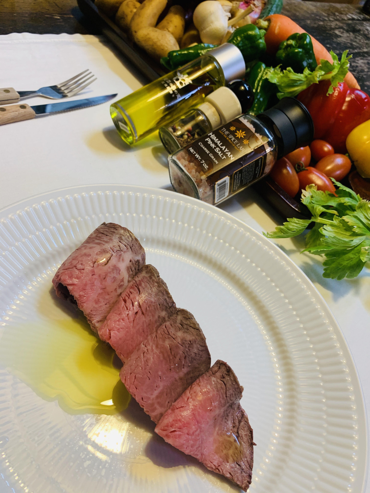 お好きな厚さに切り、お野菜やうすくスライスしたタマネギと付属のタレをつけて