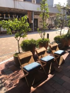 お買い物で疲れた時や、商品が出来上がるまでの間に座ってちょっと一息ついてみてください 青い空、緑もあり、程よい光があり「はぁ~」と深呼吸! 気持ちいいですよ~ いつもの中通りが違う景色にみえます。少し大げさですが、、、、、 普段時間に追われている時こそちょっと休憩が大事です。 今はまだ暑いですが、涼しくなったらほっこりしてみてください。